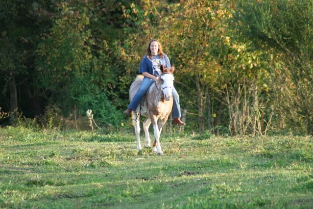 After the first winter of mucking that nasty cow stall, I was desperate to find a way to keep her OUT of there as much as possible. Plus, she would lay in the mess and come milking time, I had manure to clean off before I milked. Not real appetizing. I ended up dumping lots of milk because I couldn't bring it in the house knowing what I'd just wiped off of her. Yuck. I have Jerseys. I'm pretty sure a Dexter would be easier on a stall. They would have to be, right? :) I still say you should fence off an area for your cow separate from your horses. Or at least be prepared to in case it doesn't work out having them together. I don't have horses anymore, but I sure do miss them. Your horse is very pretty. Is it a red roan medicine hat paint mare? She looks like a gentle horse being ridden in just a halter. |