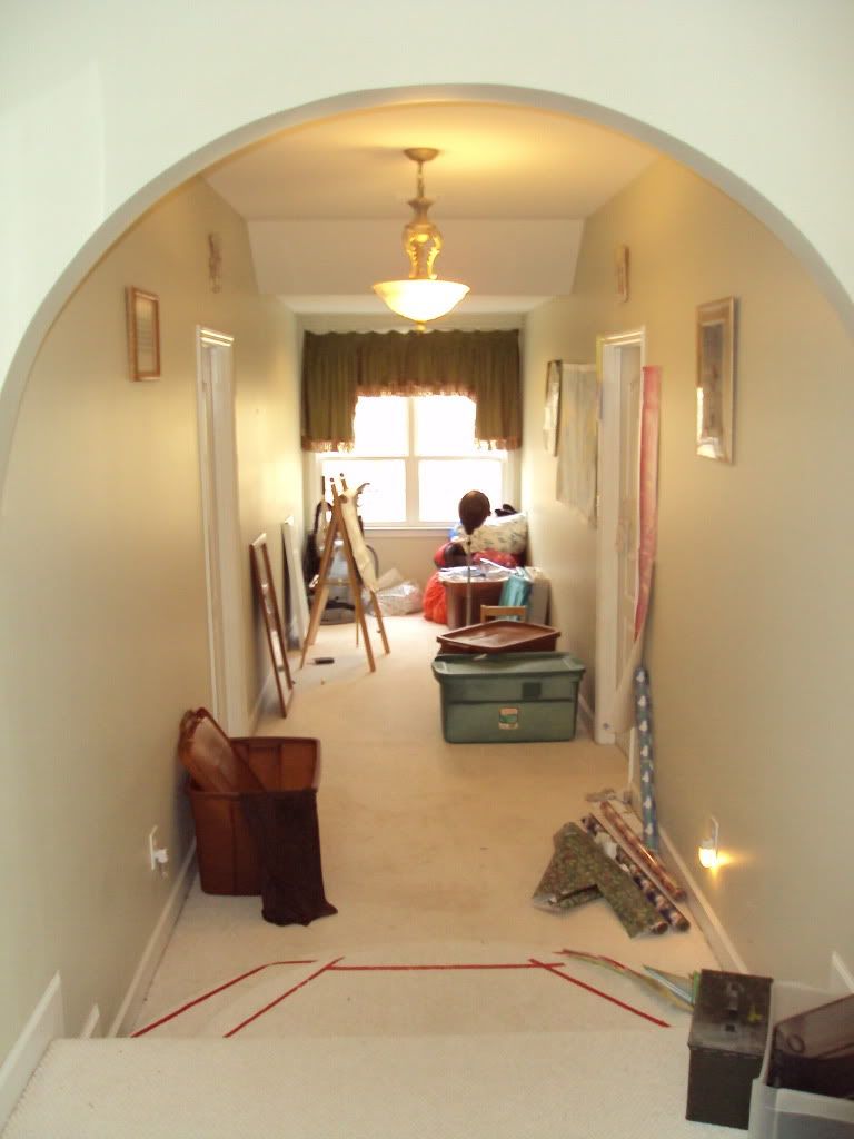 Jenn, straight steps would be much more appropriate. There is a reason for the use of wedding cake stairs, and it is typically where a hall or raised area opens out onto an expanse. About the only possible (lame) justification for using such stairs in what is a 6' wide hallway is to keep people away from the walls. Were bedrooms added into what was originally designed to be a great room? That could explain the stairs being left where they were. Architecturally, they are totally inappropriate for the spot.
