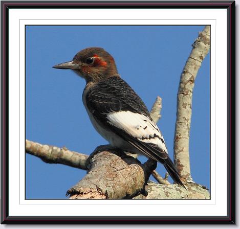 Definitely a woodpecker, about the size of a Red Headed woodpecker. It's back was mostly black with some faint barring or maybe mottling. The folded up wing tips formed a solid white band. It's head seemed to be mostly black or very dark brownish black, and it had some dark red markings above and slightly behind each eye, like it was wearing red eyeshadow. No other red visible on the birds head. It had what looked like a thin white 'collar' at the base of it's neck but I couldn't see it's front very well.