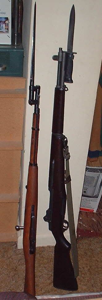 fantasymaker and OldVet - next to the M-1 Garand in .30-06 is a Mosin-Nagant M-44 bolt action Carbine with the folding Bayonet in 7.62X54 Russian caliber (A Soviet Bloc Weapon/ I have 4 of them "Russian issue" myself and gave an additional 1 to my brother "Polish" issued/ and another 1 to my dad "Russian")....I also have a M-N 91/30 long verson also in 7.62X54R. You can still get them for less than $100.00 each - just watch your sporting goods store sale papers.... Surplus ammo is available for them also online!!
