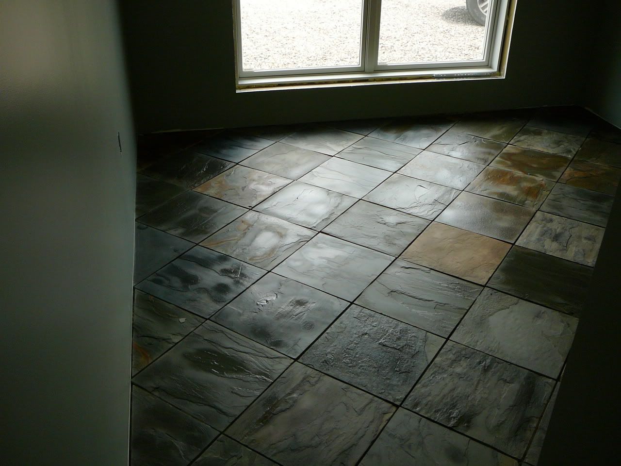 Time for another update. We ran out of slate and had to order 2 more pallets. The damage / ugly rate was a bit higher than expected but what can you do. So in turn we moved on to doing the kitchen floor and ordered the kitchen cabinets. Here is the flooring that we have done for the kitchen: