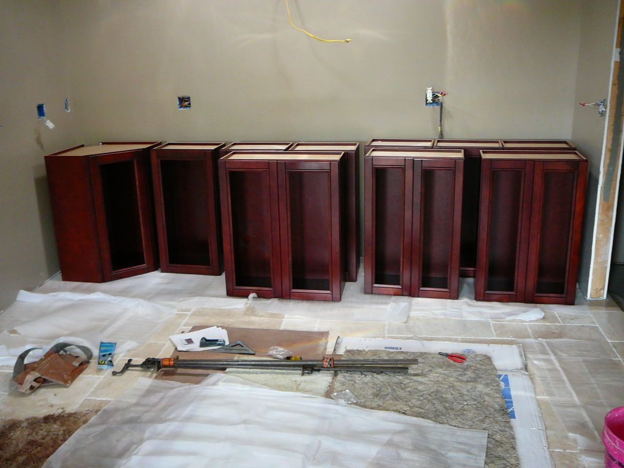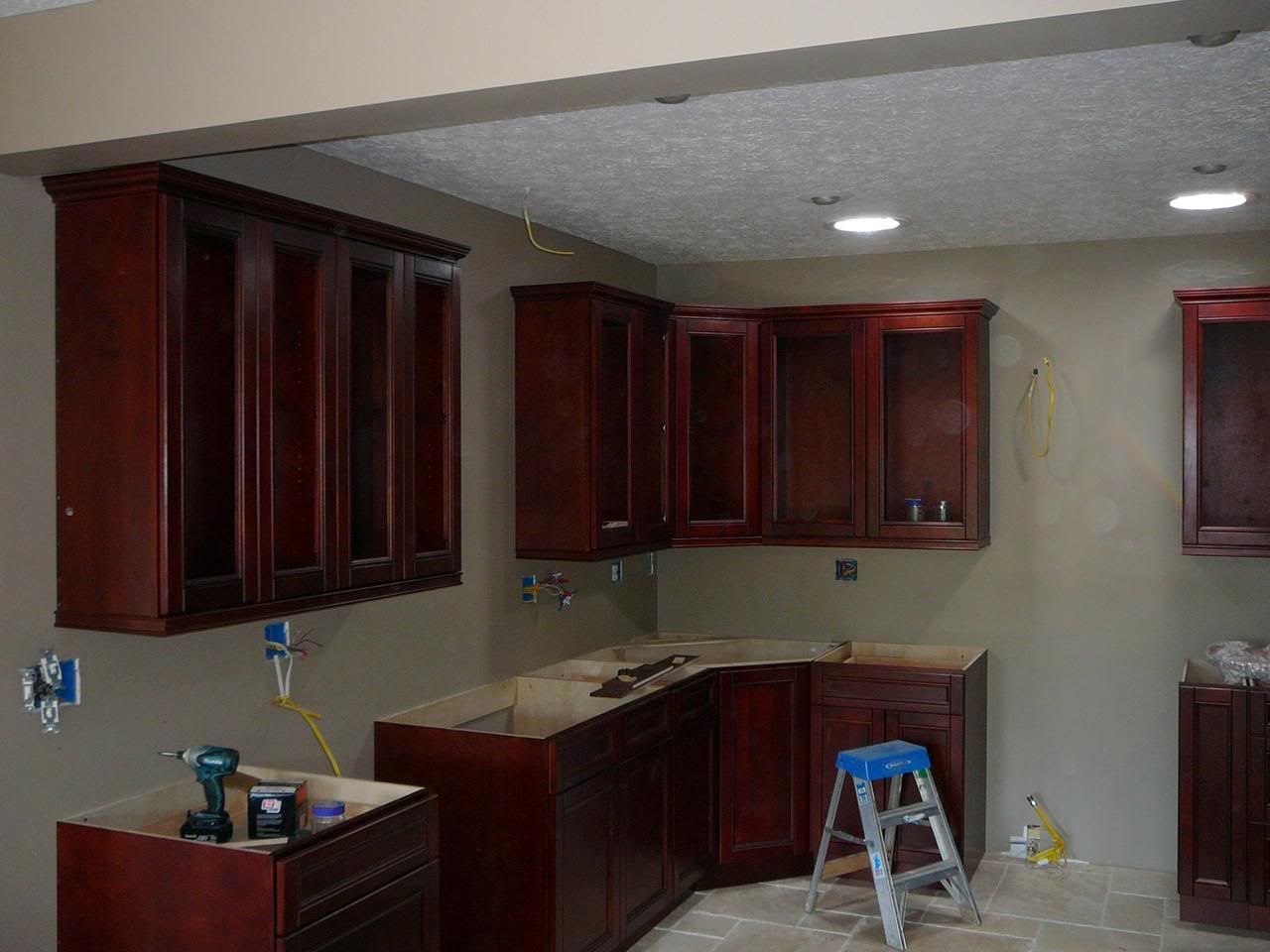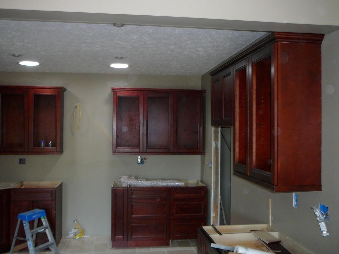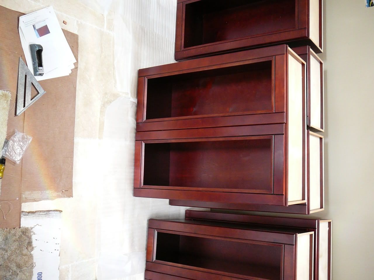 http://i121.photobucket.com/albums/o...n/P1000685.jpg http://i121.photobucket.com/albums/o...n/P1000686.jpg They were ordered online and are maple stained cherry. They come in flat boxes and take about 20 min each to assemble with a staple gun, hot glue and some clamps. So far I am impressed with the quality of the cabinets and the company but will hold off final evaluation till they are all on the walls. I will be doing a panoramic view across the glass uppers with either etched glass or stained (When I get more free time. I knew art classes would come in handy). Anyways thats all for now. |