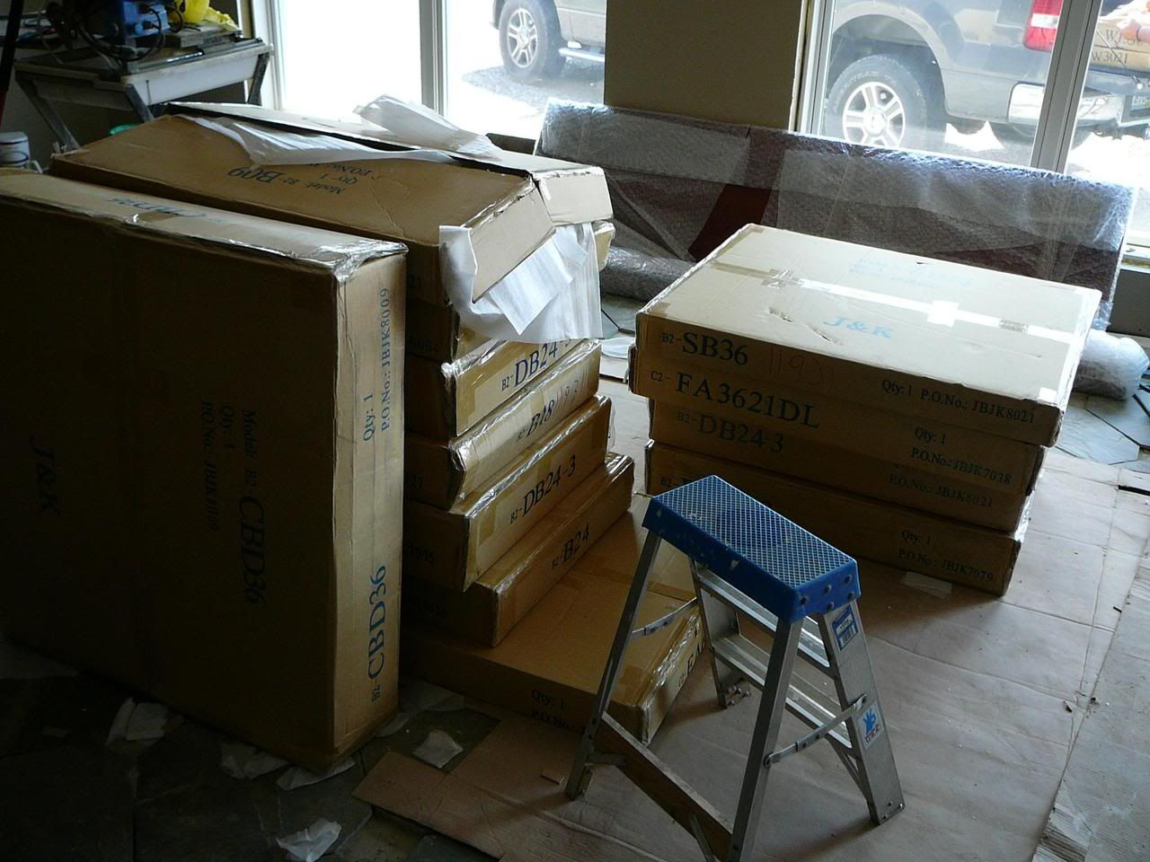 Just another quick update. The cabinets all arrived not to long ago. They arrived by freight on two long pallets which we had to unload and bring into the house:
