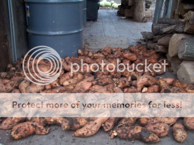 You might grab MichelleIL on your way. She's been putting off a visit just about long enough now..... Here are a few shots of some of the fruits of our labors. Starting out is a shot of the later watermelon patch shown in an earlier pic. Note the lighter colored growth in the upper right, which is the peanut patch. http://i429.photobucket.com/albums/q...T/100_1613.jpg A sample of my "Indian" corn, next to some well-formed ears of Stowell's Evergreen sweet corn hung to dry. http://i429.photobucket.com/albums/q...T/100_1564.jpg Last year's sweet potato crop. http://i429.photobucket.com/albums/q...T/100_1903.jpg A sampling of the tomatillas. I don't plant those anymore. I just have to decide which volunteer patch to weed around. http://i429.photobucket.com/albums/q...T/100_1595.jpg A selection of jalapenos. Some of them were pushing 6 inches this year. http://i429.photobucket.com/albums/q...T/100_1357.jpg Last year's red potato crop. We grow reds, whites, and Yukon Gold yellows. http://i429.photobucket.com/albums/q...T/100_1608.jpg And..... well, I'm feeling ornery again. http://i429.photobucket.com/albums/q...T/100_1256.jpg Rose, I do still get a little worm damage here and there, but their activity is decreasing as the soil improves. Like the potato bugs, they make their presence known on the outer edges of the garden patches where the clay hasn't yet been completely overlaid with compost. It has taken me several years, even with ample compost applications, to reach the overall super tilth and rich sponginess that grows anything, worry-free. |