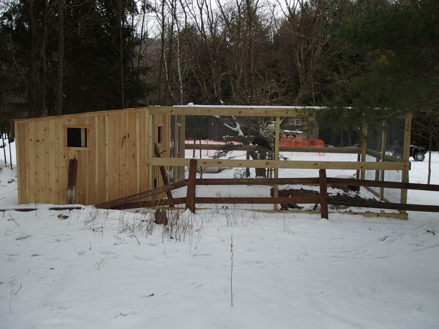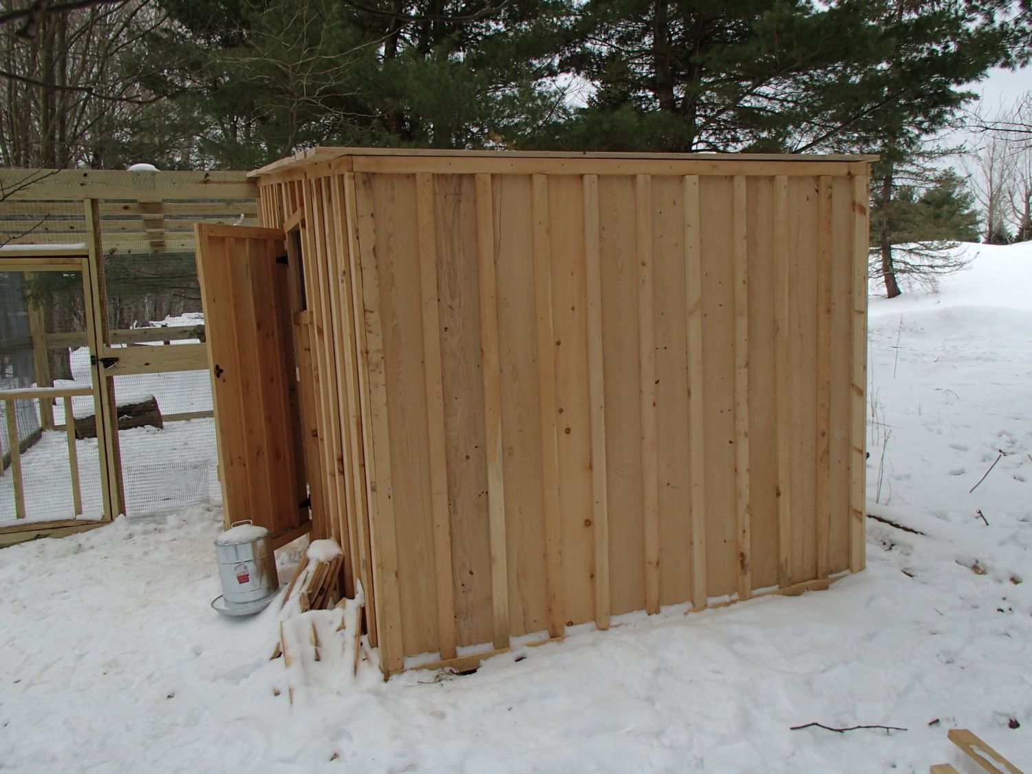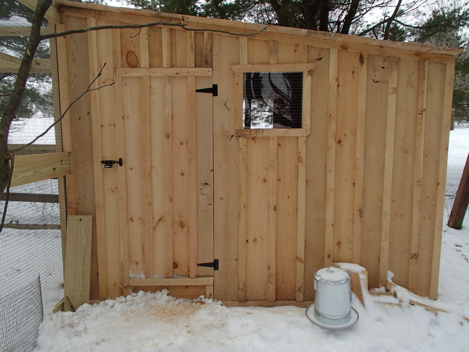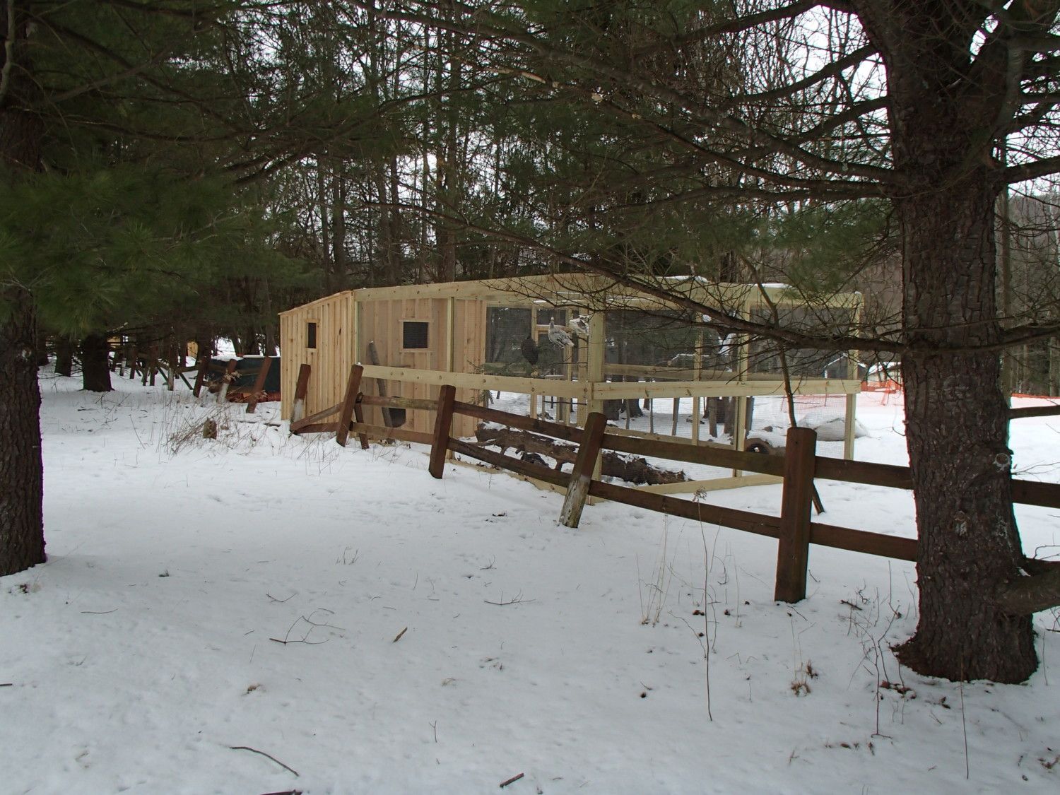 I don't expect to the tree to live long, The wood used as the siding and trim is Mix of Hemlock and Pine, the Aviary is made from PT Lumber, as is the frame of the Coop, I could have gotten the framing lumber off my land also but went with PT instead.